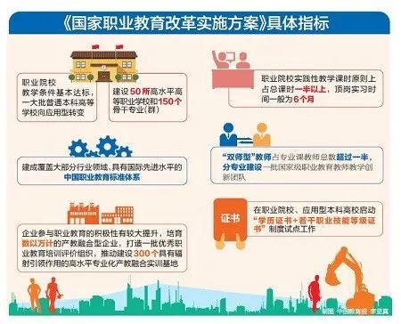 日前国务院印发了《国家职业教育改革实施方案》。《方案》指出,要坚持以习近平新时代中国特色社会主义思想为指导,把职业教育摆在教育改革创新和经济社会发展中更加突出的位置,明确职业教育与普通教育是两种不同教育类型,具有同等重要地位。
